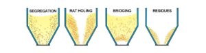 1- عدم ریزش 2- ریزش بصورت سوراخ لوله ای در وسط 3-پل یا طاق بستن 4-باقی ماندن مواد در گوشه های سیلو